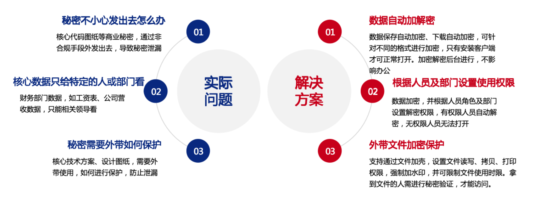 客户痛点:企业终端环境为互联网环境,用户可通过微信、邮件外发文件,或者通过U盘、刻录设备拷贝文件,或者通过打印机打印文件,一但商业秘密通过这些渠道泄漏出去,后果不可估量。