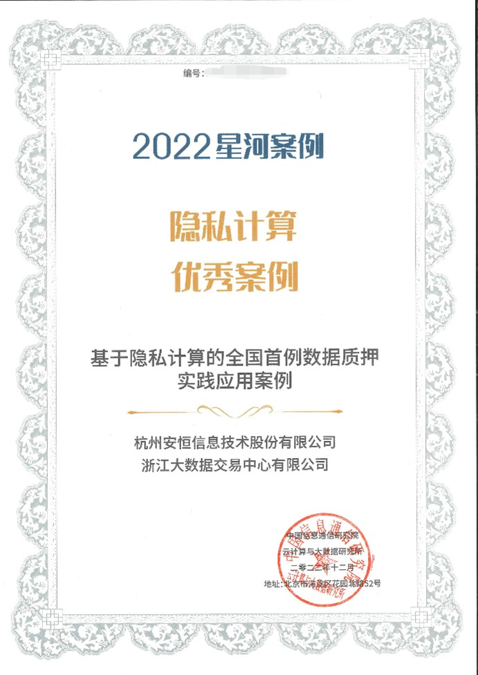 2021年上半年,安恒信息战略入股浙江大数据交易中心。双方合作案例获得2022年中国信息通信研究院、中国通信标准化协会大数据技术标准推进委员会(CCSA TC601)共同组织的大数据“星河(Galaxy)”案例隐私计算优秀案例。