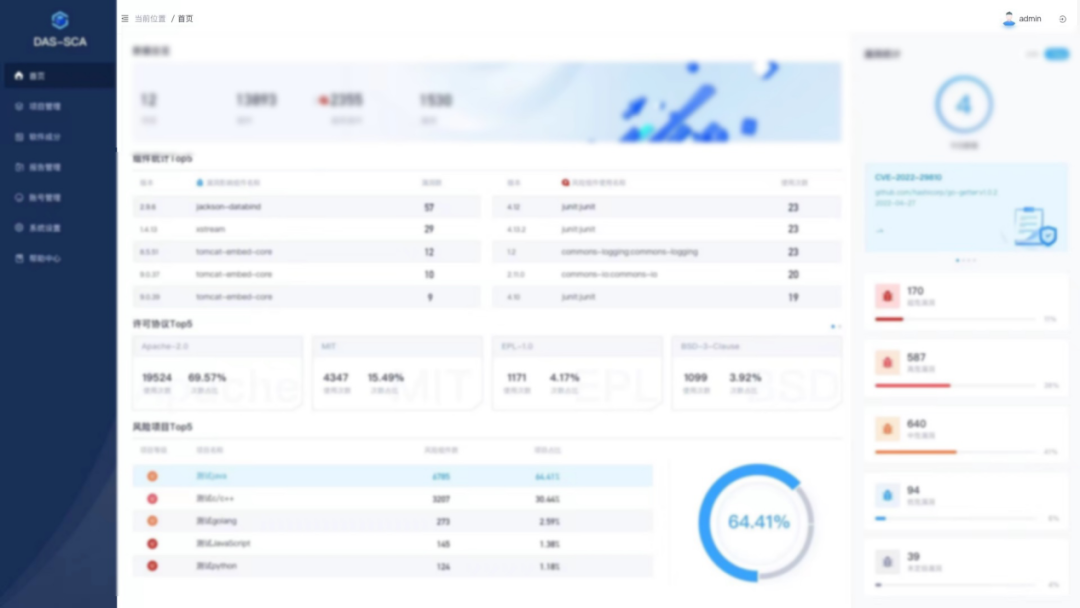 安恒信息车联网和中央研究院共同推出的“软件成分分析平台”是一款智能组件风险分析平台(以下简称“DAS-SCA”),是面向软件开发安全需求研发的基于软件开发安全生命周期管理的组件风险检测平台。该平台能够在企业软件开发期及上线后进行风险检测和监测,形成软件应用生命周期管理。DAS-SCA支持对源代码、二进制等文件中的组件进行深层解析,实时监测0day风险。并基于机器学习技术,能够对项目引用到的组件及漏洞进行高效深层分析。
