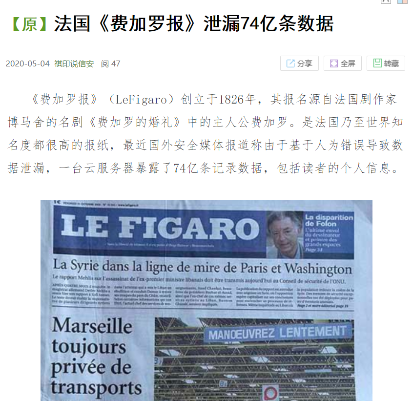 2020年5月,法国《费加罗报》泄露74亿条数据