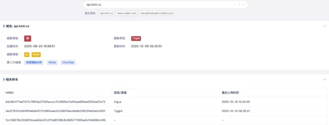 回连域名:自动化提取恶意文件在沙箱中运行时回连的域名和IP,便于威胁验证和情报孵化;