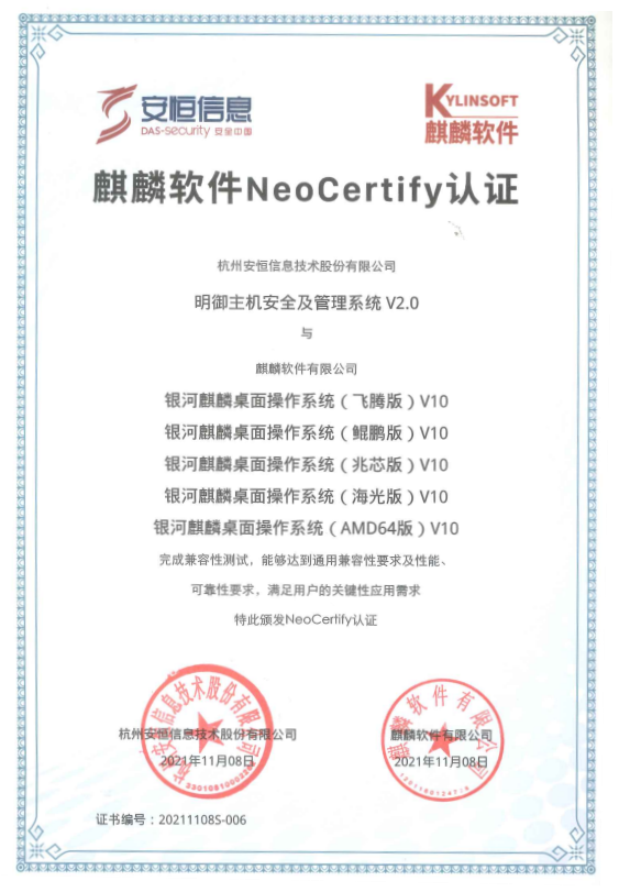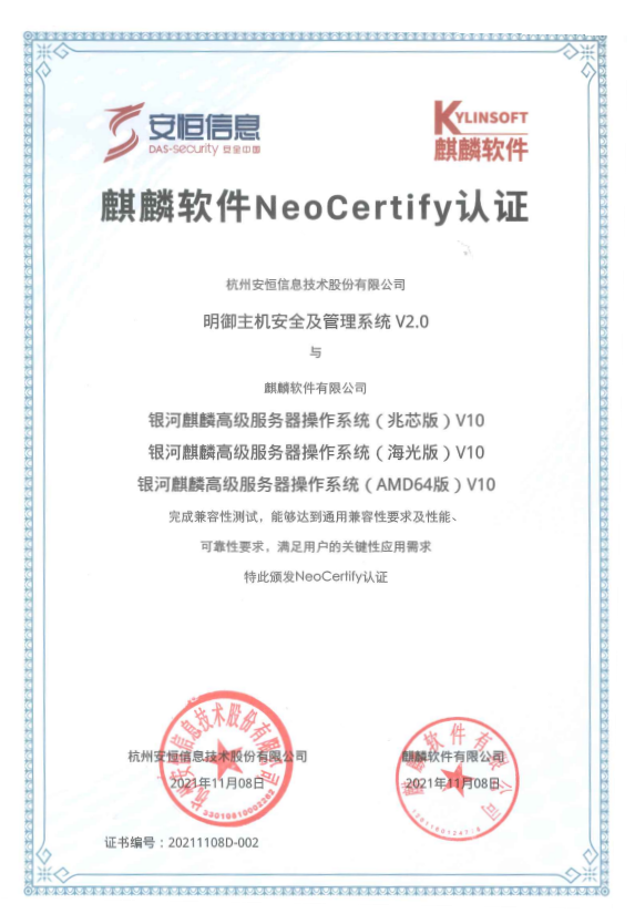 近日,安恒明御®主机安全及管理系统EDR(简称安恒EDR)与银河麒麟高级服务器操作系统、桌面操作系统完成了产品兼容性测试。