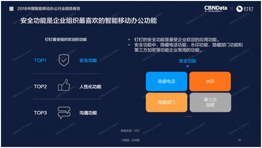 远程办公的关键因素是“安全”, 在2018年公布的移动办公数据中,安全也成为众多组织、企业选择钉钉最重要因素。而第三方加密产品——安恒密盾在钉钉生态中扮演着重要的“安全卫士”的角色。