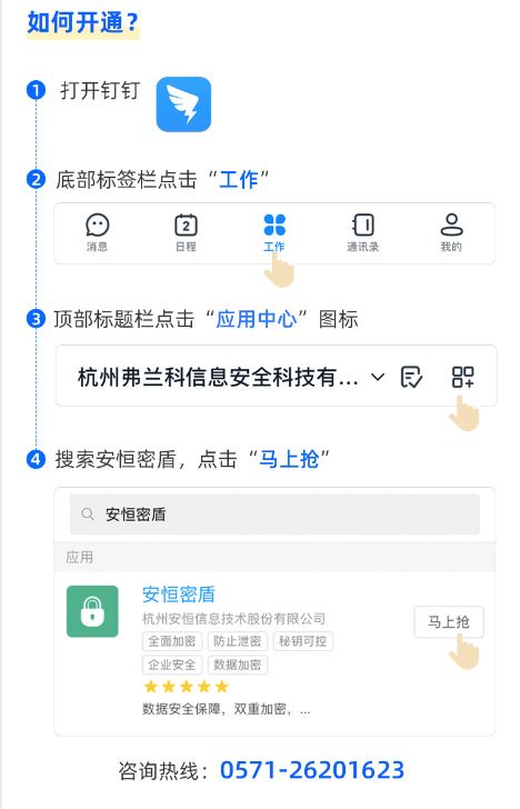 在钉钉程序内,点击“工作”栏,进入右上角“应用中心”,搜索“安恒密盾”,点击“马上抢”,即可免费使用。