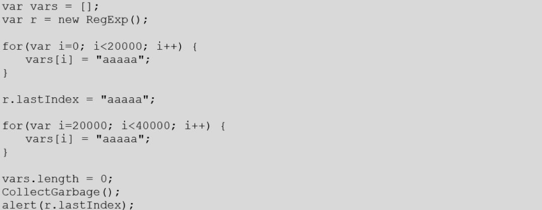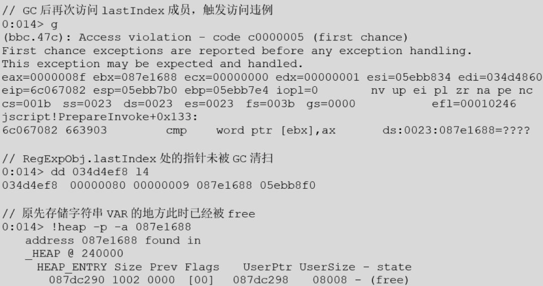 通俗一点说就是RegExp类的lastIndex成员没有被加入GC追踪列表,如果给它赋值,在GC时会导致lastIndex处存储的指针变为悬垂指针。后续再访问lastIndex时,即造成一个典型的Use-After-Free场景。