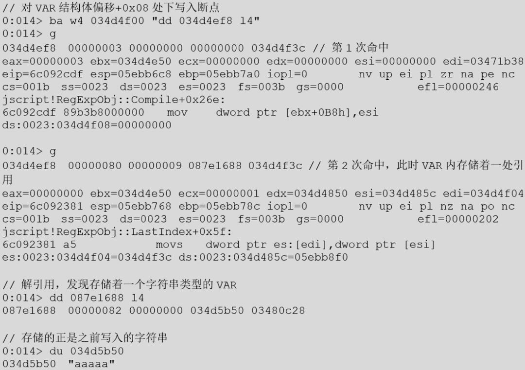 现在RegExpObj::Create函数内下断点,在RegExpObj对象创建完成后,对其偏移+A8处下一个硬件写入断点,这个偏移处存储一个VAR结构体,此结构体在x86下大小为0x10。重点观察+B0处的数据变化。