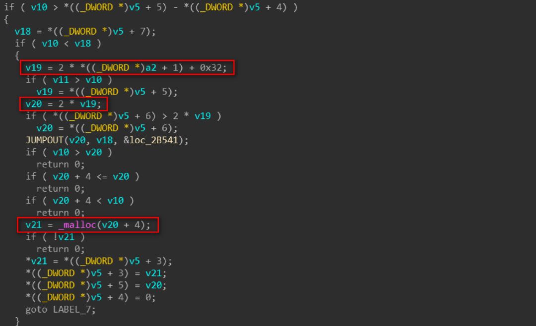 NameList::FCreateVval函数内在申请成员变量名内存时,若成员名长度超过一定值,就会额外申请内存去存储这些名称。第一个成员名可以用来控制申请的内存大小,相关计算过程已经在前面说明。后面的成员名称只要长度合适,就可以在第一个成员名称初始化时申请的内存中使用剩余的部分,从而用来布控内存。