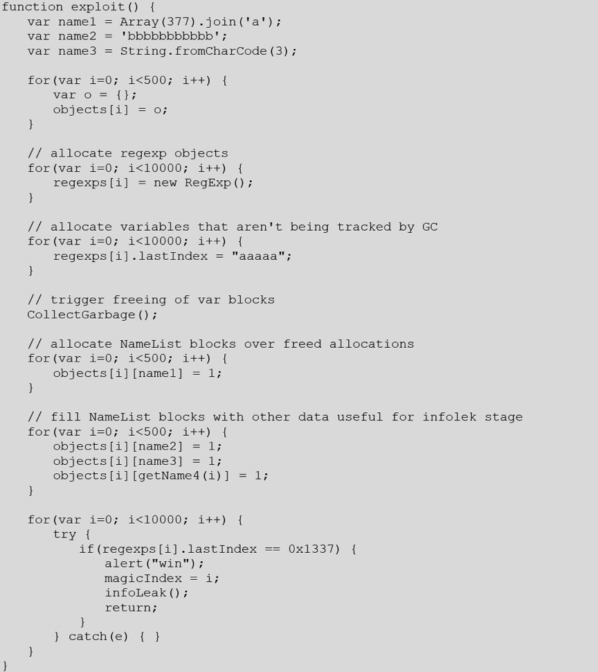 name1用来申请大小为0x648的内存。name2可调节,用来对齐。name3用来指定类型,以泄露特定偏移处的一个指针,这个后面再会提及。name4用来布控0x1337对应的VAR,用于jscript代码中的条件判断。