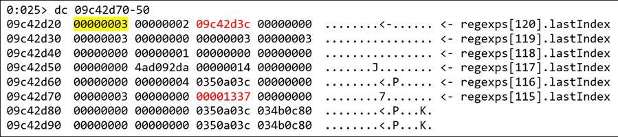 所以,在x86下,如果找到了0x1337对应的regexps[i].lastIndex,就可以通过读取regexps[i+5].lastIndex来泄露相关指针,减去固定偏移就得到被重用内存的起始地址了。如下: