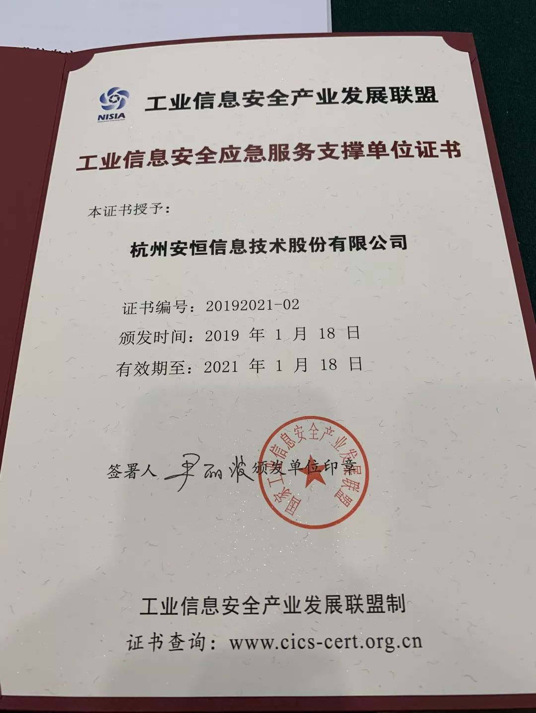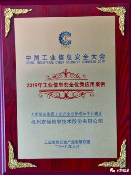 2019年1月18日,安恒信息入选第一届工业信息安全应急服务支撑单位。作为首批支撑单位,安恒信息积极发挥自身在应急服务规范、应急服务案例、应急服务保证、技术实力、技术优势等方面的优势能力,全面布局包括电力、水利、天然气、烟草、有色金属、石油、智能制造、市政等行业在内的工控安全防护体系的落地,行业解决方案获得了包括使用单位、科研机构、主管单位、监管单位等多方认可,产品在行业内具有较高的稳定性,为客户带来可量化的经济效益和客观的社会效益。其参与的项目在2018、2019连续两届获得中国工业信息安全大会的《工业信息安全优秀实践案例》荣誉,参与的“发电厂控制与管理系统信息安全防护关键技术及应用”分别获得了《CAA科学技术进步奖》等多个荣誉。为工业行业信息安全智能防护带来新技术和新方向,并形成了可靠的实践成果。