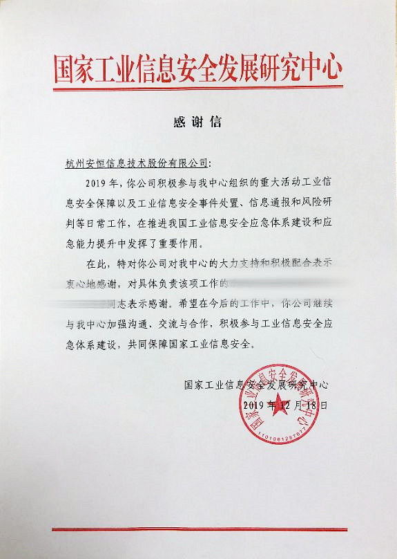 近日,安恒信息收到国家工业信息安全发展研究中心发来的感谢信。感谢信中表示,安恒信息积极参与国家工业信息安全发展研究中心组织的重大活动工业信息安全保障以及工业信息安全处置、信息通报和风险研判等日常工作,在推进我国工业信息安全应急体系建设和应急能力提升中发挥了重要作用。