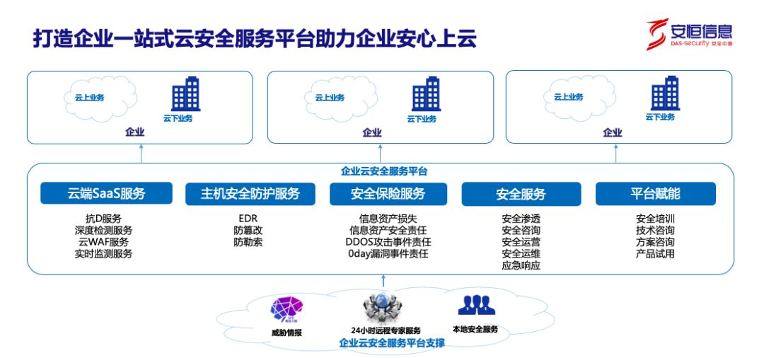 针对近年来企业常见的勒索事件,安恒信息通过云端威胁情报与EDR防御查杀相结合,形成勒索病毒预警防御一体化;对于支撑生产系统的工业云,提出了基于等保2.0的整体安全解决方案,包含整套云上安全技术服务方案和保险理赔方案。