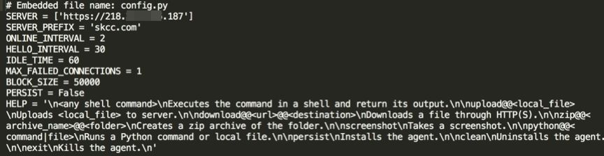 内部包含程序执行所需要的各种配置信息,如回连地址信息“hxxps:// 218.*.*.187”,服务前缀“skcc[.]com”,帮助信息等等。