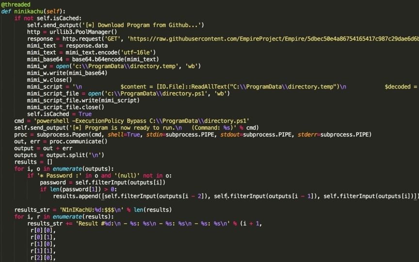 再来看看“Ninikachu”这个函数功能是使用mimikatz,两个单词拼读起来也感觉类似,推测攻击者可能是南亚某国的口音。