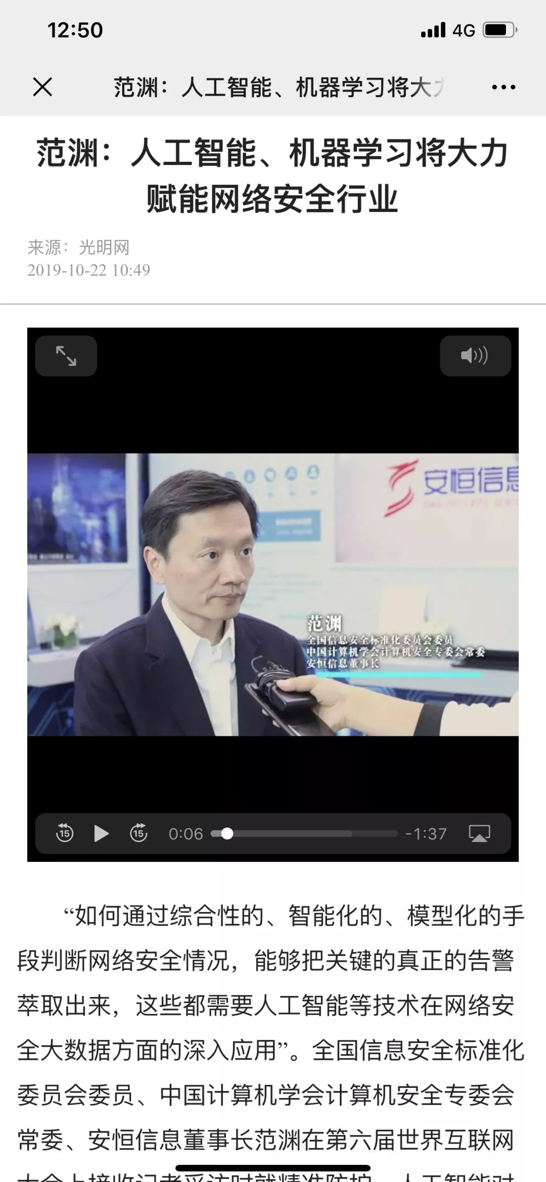 安恒信息董事长范渊在接受《焦点访谈》采访中表示,人工智能、大数据让网络安全应用进入新台阶,更精准的防护、更精准的研判、更自动化。
