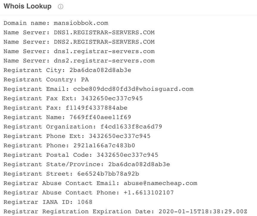 友商曾在2018年初发布过《CVE-2017-8570首次公开的野外样本及漏洞分析》一文,文中攻击组织利用CVE-2017-8570漏洞进行文件投递,投递样本使用的payload为FormBook,并且样本使用VB编写,也是解密出真正的恶意代码注入进程中执行,并且在给出的回连域名中有mansiobbok[.]com这个域名,和人生就是搏z6尊龙关联到的mansiobbok[.]info仅后缀不同,查询mansiobbok[.]com的whois信息,发现也是在相同地方注册的域名。