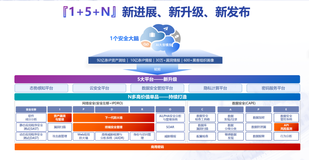 此次新品发布会,围绕“2大战略、1+5+N创新产品体系及生态合作”打造安恒信息全景产品体系,聚焦“MSS+数据安全”2大战略新进展,以“安恒安全大脑”全面赋能,实现“云安全+态势感知+数据安全+隐私计算+密码服务”5大平台全新升级,持续打造N多高价值单品,构建生态合作伙伴新模式,共同绘就一幅崭新的安恒信息产品全景图。