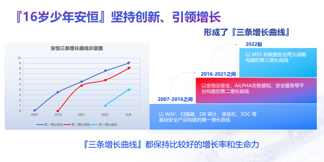 回顾“16岁少年安恒”的三条增长曲线,从技术到平台,从策略到战略,每一步求真务实,稳扎稳打。