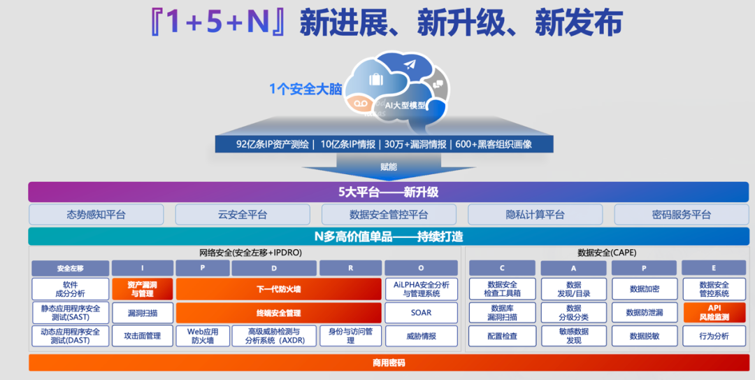 作为西湖论剑的系列预热活动之一,范渊表示,此次新品发布会集中展示“1+5+N”的创新产品体系。安全大脑作为安恒信息产品体系的赋能者,通过92亿条IP资产测绘、10亿条IP情报、30万+漏洞情报等网络安全核心数据的训练,其资产测绘能力、情报能力得到了非常大的提升。通过做实“云安全+态势感知+数据安全+隐私计算+密码服务”5大平台和N多高价值单品,引领安恒信息产品步入3.0时代。