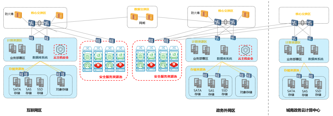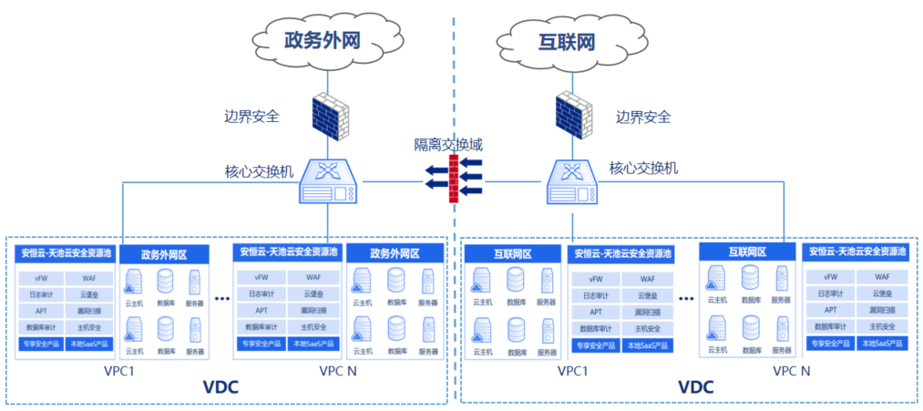 昆明市政务云采用融云模式部署安恒云-天池云安全管理平台,构建云安全服务资源池,为昆明市政务云各委办局业务信息系统提供30余种云安全专享和SaaS化安全能力,实现安全资源目录化、套餐化、服务化。各委办局按需申请和开通云安全服务能力,对应的安全能力自动部署到委办局归属的VDC网络内,继而实现对云上业务/应用/网络的安全保护。