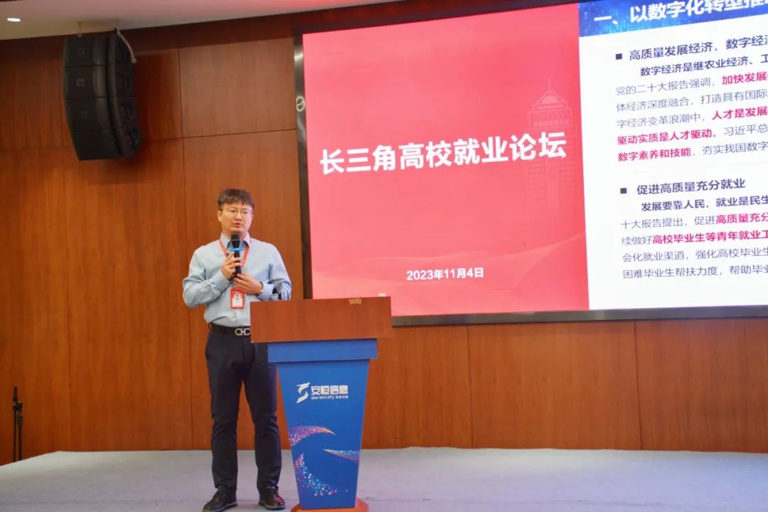 安恒信息董事长范渊在交流会上发表致辞,热烈欢迎各领导及长三角高校就业部门负责人的到访,深切表示“人才战略是安恒信息三大战略之一,校园人才战略是公司人才战略的重要组成部分”,并诚挚地向各高校负责人发出“深化校企协同育人,实现应用型人才培养和校企合作共赢”的邀约。