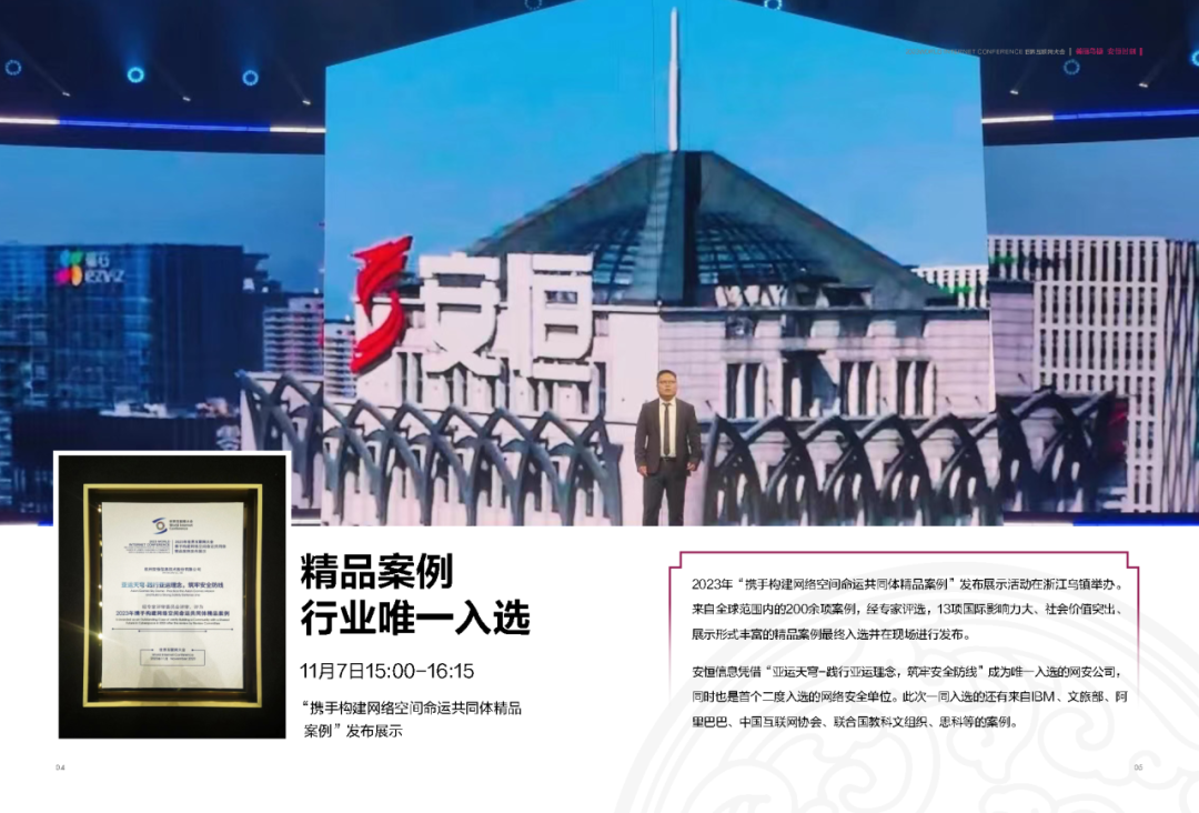 在2023年“携手构建网络空间命运共同体精品案例”发布展示活动中,安恒信息“亚运天穹-践行亚运理念,筑牢安全防线”入选,成为本次发布活动中唯一一家国内网络安全企业,同时也是首个二度入选的网络安全单位。