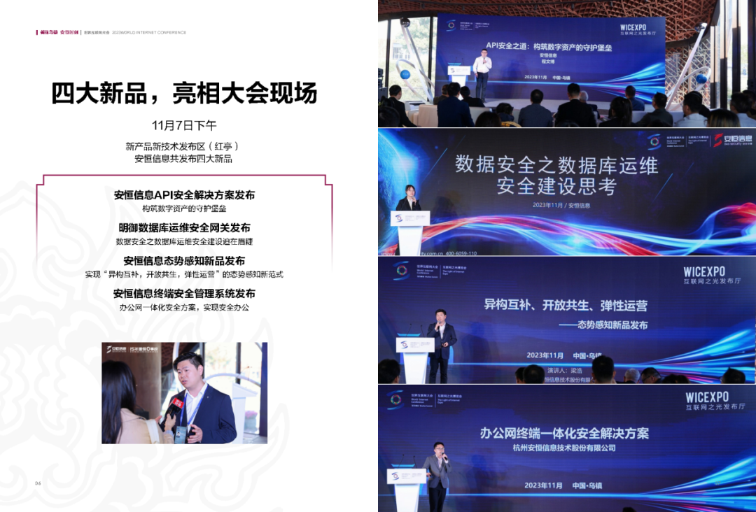 乌镇新产品新技术发布会举办,安恒信息精心打磨的态势感知、API安全解决方案、终端安全管理系统、数据库运维安全网关四大新品现场发布。