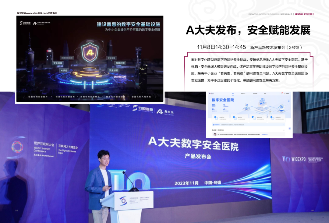 历经三年打磨,基于恒脑·安全垂域大模型打造的“A大夫数字安全医院” ”是安恒信息针对中小企业研发和建设的普惠数字安全基础设施,在2023世界互联网大会期间正式升级发布。