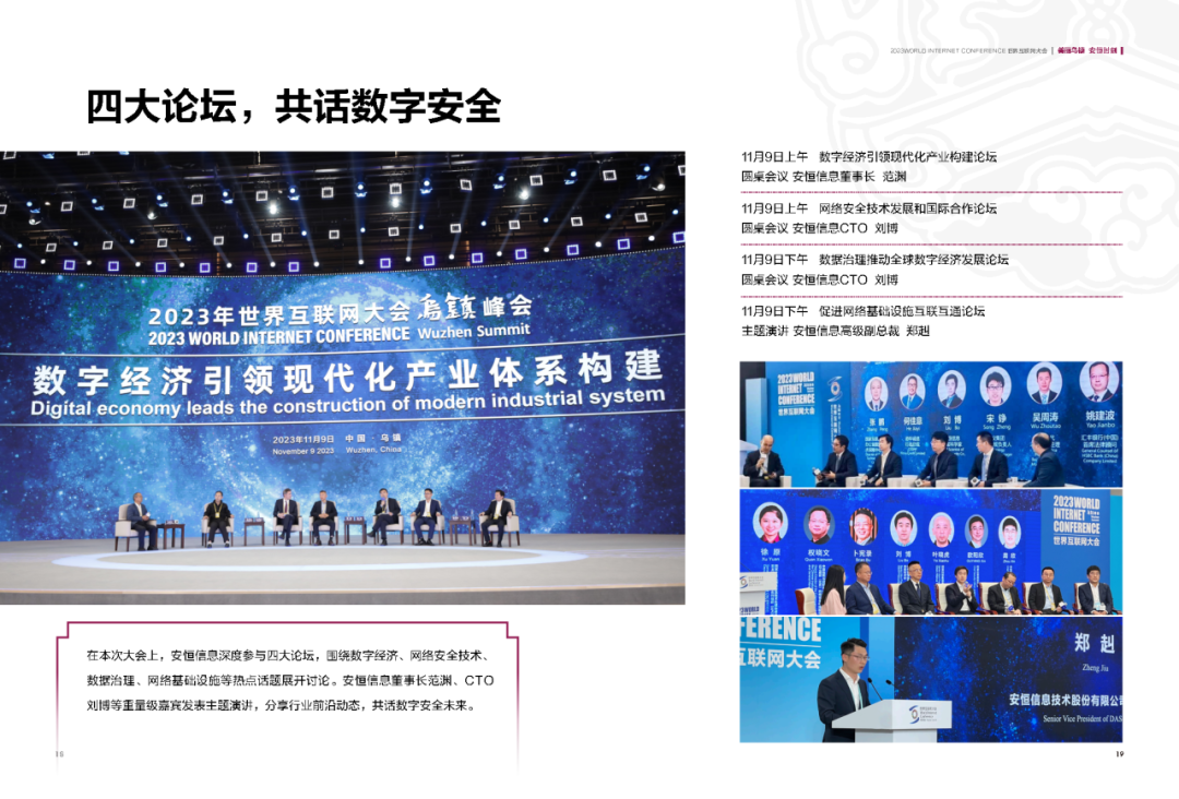 在乌镇峰会期间,安恒信息董事长范渊、CTO刘博、高级副总裁郑赳分别参加四大论坛,围绕多个行业热点话题展开探讨,共话数字安全未来。