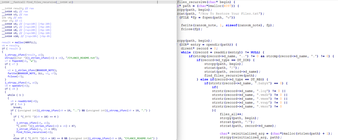 对比Babuk的Linux/VMware ESX源码,例如在文件遍历的函数部分,其结构一致,函数名相同,替换了勒索信名称和需要比较的扩展名