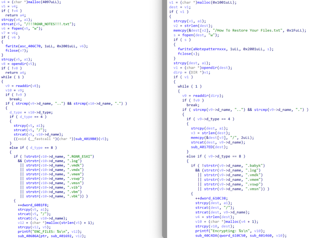 2023年9月,Ragnar Locker的Linux变体样本被披露,发现其同样是基于Babuk代码构建,伪代码比较如下图所示。