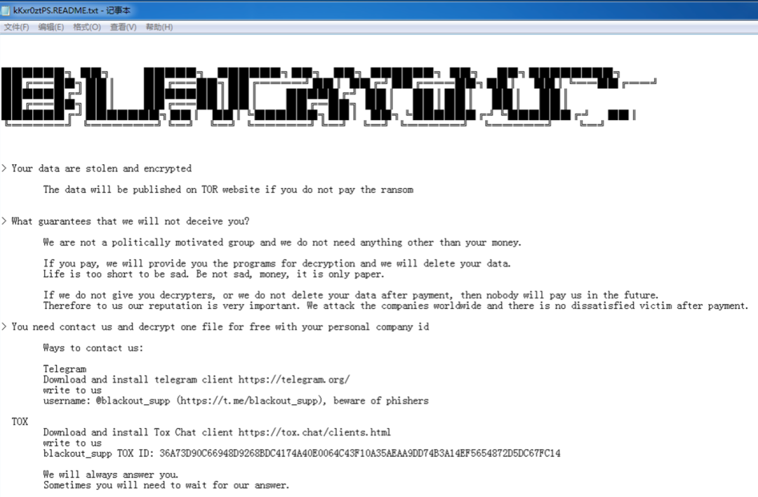 与此类似的还有Blackout勒索家族样本,勒索信同样具有独特的风格。