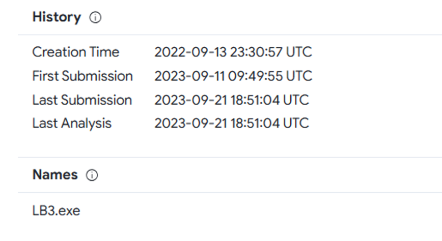 这类基于LockBit构建器所开发的勒索样本,编译时间都为2022-09-13 23:30:57 UTC,而且在VT中的文件名往往含有“LB3”字样,这与构建器生成的文件名类似。