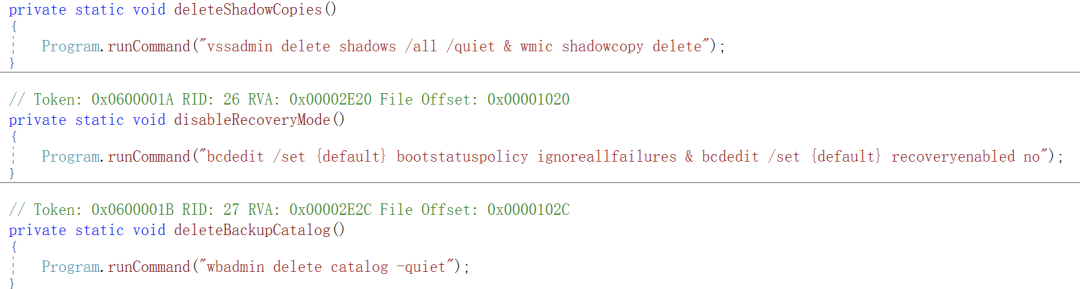 在加密前执行删除卷影副本、删除备份、禁止自启动修复的命令操作。