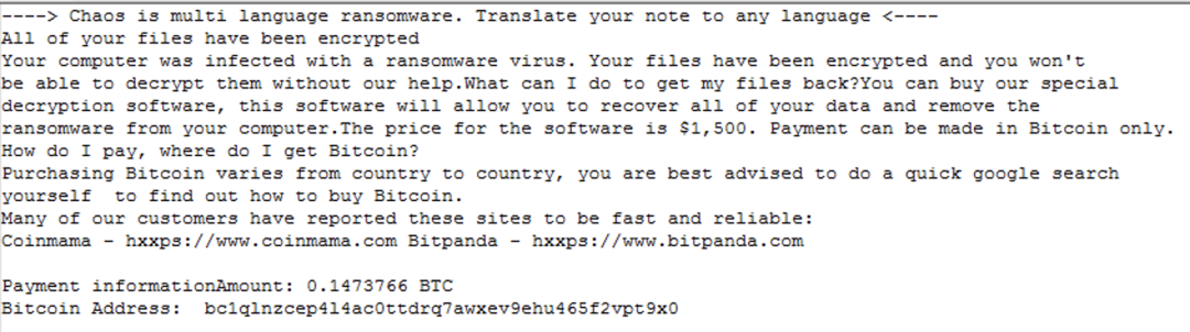 在2023年,人生就是搏z6尊龙发现了一系列由Chaos勒索构建器生成的勒索样本,它们往往只更改了一些数据信息,例如壁纸图片、勒索信内容以及联系渠道、比特币地址等,而在代码和功能上与原有的Chaos勒索保持了一致。