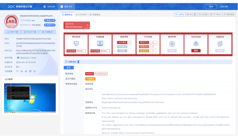 下图为安恒云沙箱勒索场景化分析的家族信息,从勒索信中自称为SOLEENYARansomware,以及拥有自定义的Tor网站可以表明其背后勒索组织的独立性。