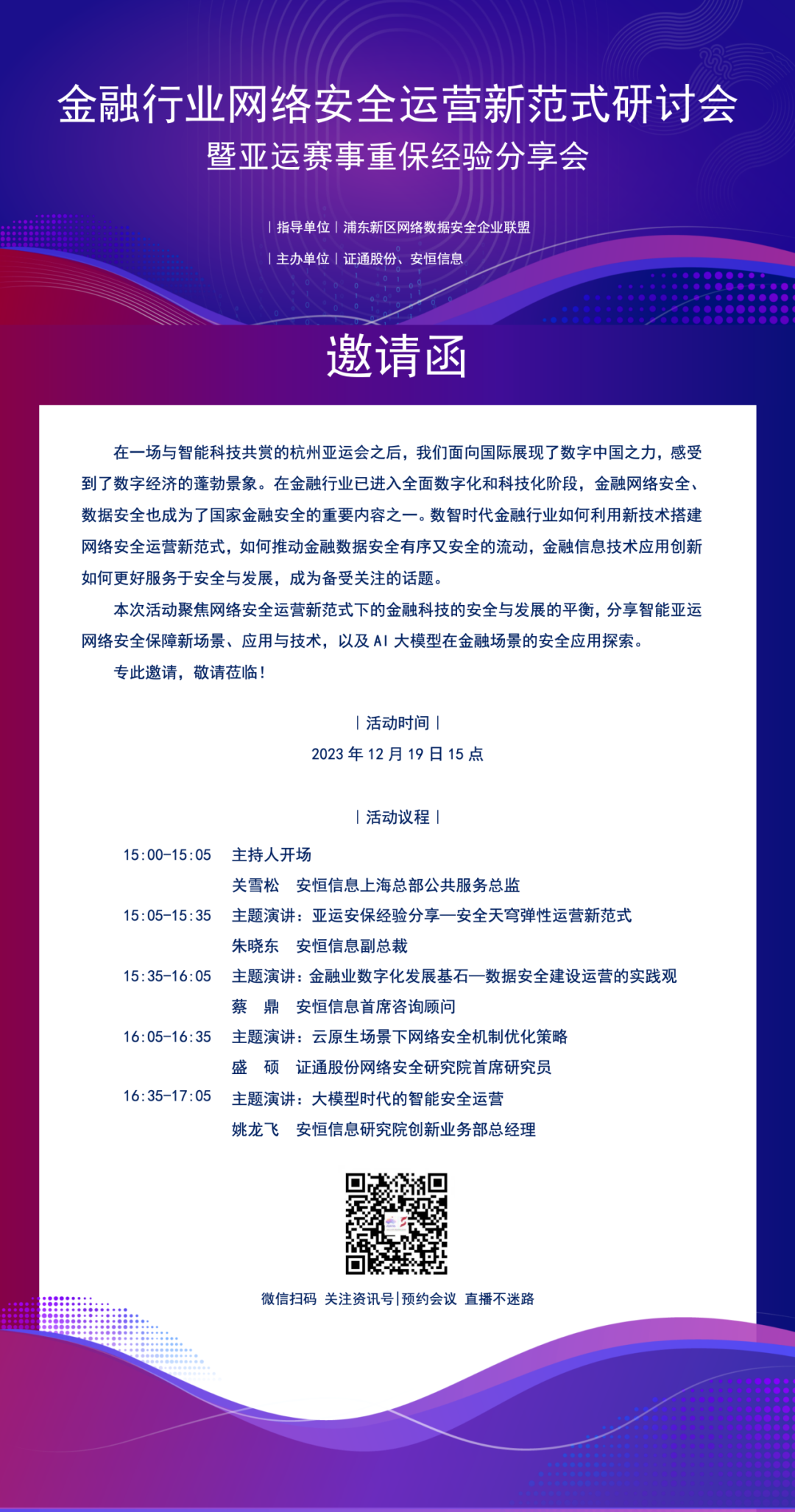 不论是数字人还是云上亚运村,抑或是机器狗、智能场馆等终端,智能亚运让网络安全保障直面了新场景、应用与技术下挑战,同时也激发了数字安全行业新技术与应用的实践与落地落地。这与金融行业科技发展的速度保持着高度的一致,同时也为金融行业的数字场景的安全解决方案提供了更多的参考案例。安恒信息将亚运重保经验中的弹性网络安全运营新范式、大模型赋能实践成果转化为金融行业网络安全保护的前沿实践能力,通力协作,共同寻求打造金融行业的最佳范式。