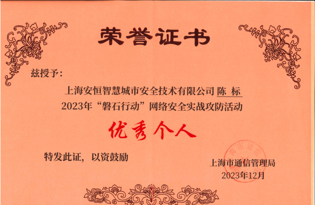 此外,安恒信息安全服务专家陈标凭借出色的个人表现,荣获了磐石行动优秀个人奖。陈标的专业知识和技能素养在活动中得到了充分展现。