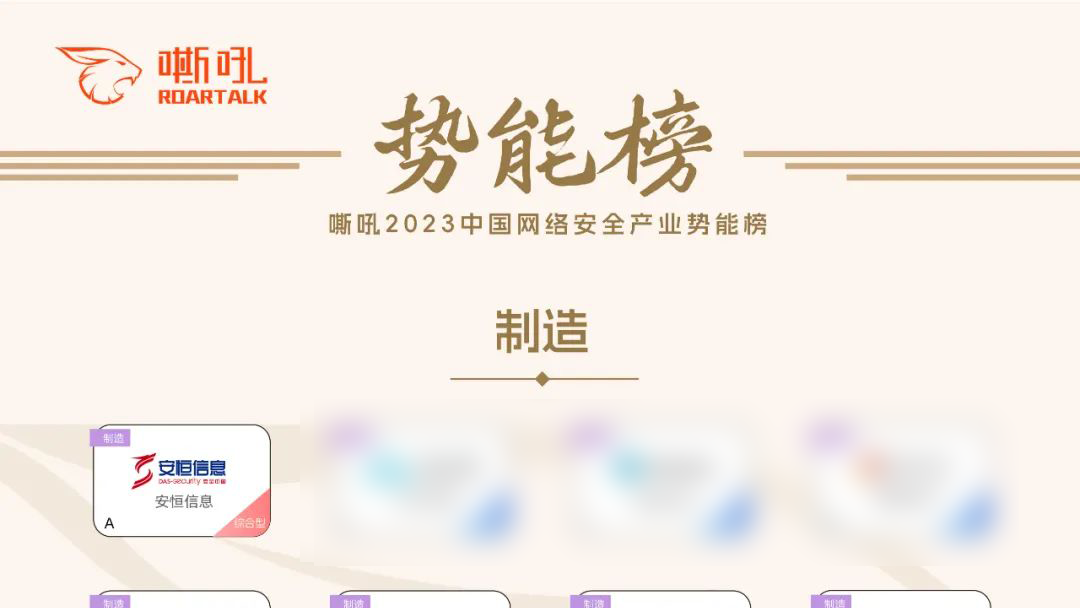 嘶吼安全产业研究院开展了《2023中国网络安全产业势能榜》的评选,旨在深入研判和展望中国网络安全产业的发展趋势,赋能网安领域头部厂商担负起自主创新、乘势而上的产业责任。安恒信息成功入选“政府”与“制造”两大榜单。这一荣誉是对安恒信息在这两大行业中数字安全领域的领先地位和卓越能力的肯定。作为行业的领军企业之一,安恒信息一直致力于为用户提供一站式综合服务和解决方案,并针对不断变化的数字安全威胁和用户需求持续进行技术研发和创新。