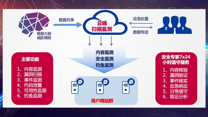 · 建有监测云中心,监测节点采用集群化部署,能够支持上万站点的网站安全漏洞、服务质量、安全事件的实时监测和发现。