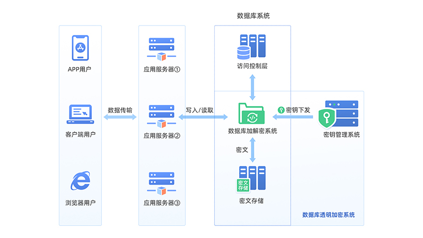数据库透明加密系统,基于国产密码算法,为用户提供安全合规、易部署的透明存储加密服务。产品支持在不更改原有数据库系统架构的情况下实现数据的透明加密,有效防止数据库存储环节可能出现的泄露风险。