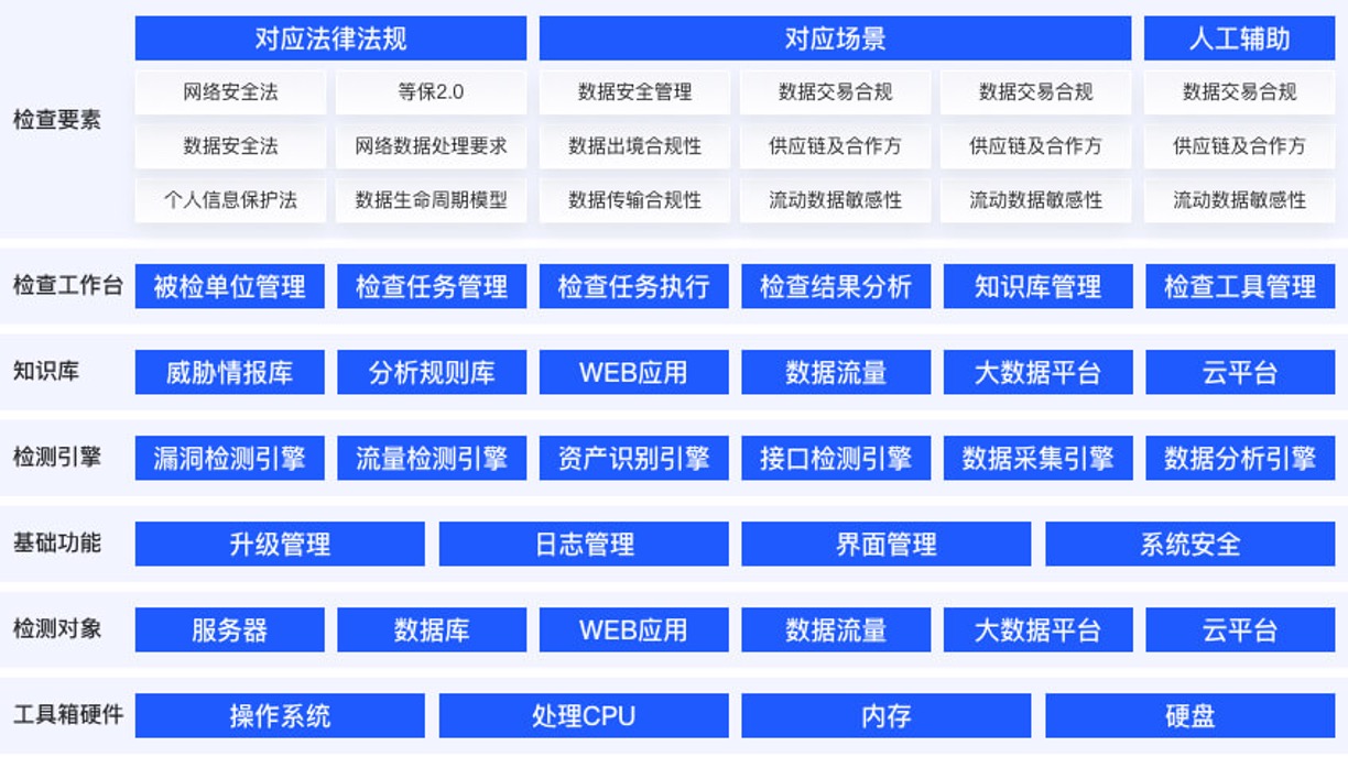 工具箱依托安恒自主研发的多类安全能力因子,覆盖了包括数据资产识别、敏感数据发现、数据接口风险监测、数据库安全检测等在内的十余类技术检测工具 。以自动化的方式快速完成检查指标的符合性判定。