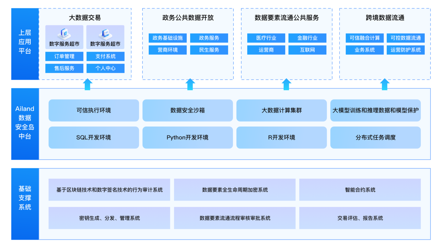 AiLand数据安全岛(TEE)平台是一个专注于保障数据安全流通,致力于解决数据共享的信任和隐私保护问题的数据开放和共享交换平台。应用机密计算、安全计算沙箱、区块链等多种前沿技术,配合关键行为数字验签和全业务流程追踪审计技术,实现共享数据的所有权和使用权分离,确保数据 “可用不可见”,保障数据共享交换过程的可靠、可控和可溯。
